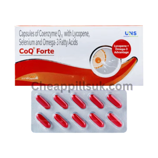 Co Q Forte is a high-potency nutritional supplement that combines ubiquinone (Coenzyme Q10) with Omega-3 fatty acids, Lycopene, and Selenium. Primarily used to support reproductive health, it improves egg quality in women and improves sperm count and motility in men. Its potent antioxidant properties also benefit cardiovascular health, energy production, and immune function while reducing oxidative stress. Common side effects are typically mild and include nausea, stomach discomfort, or diarrhea. Always consult a doctor before use, especially if pregnant or taking blood thinners.